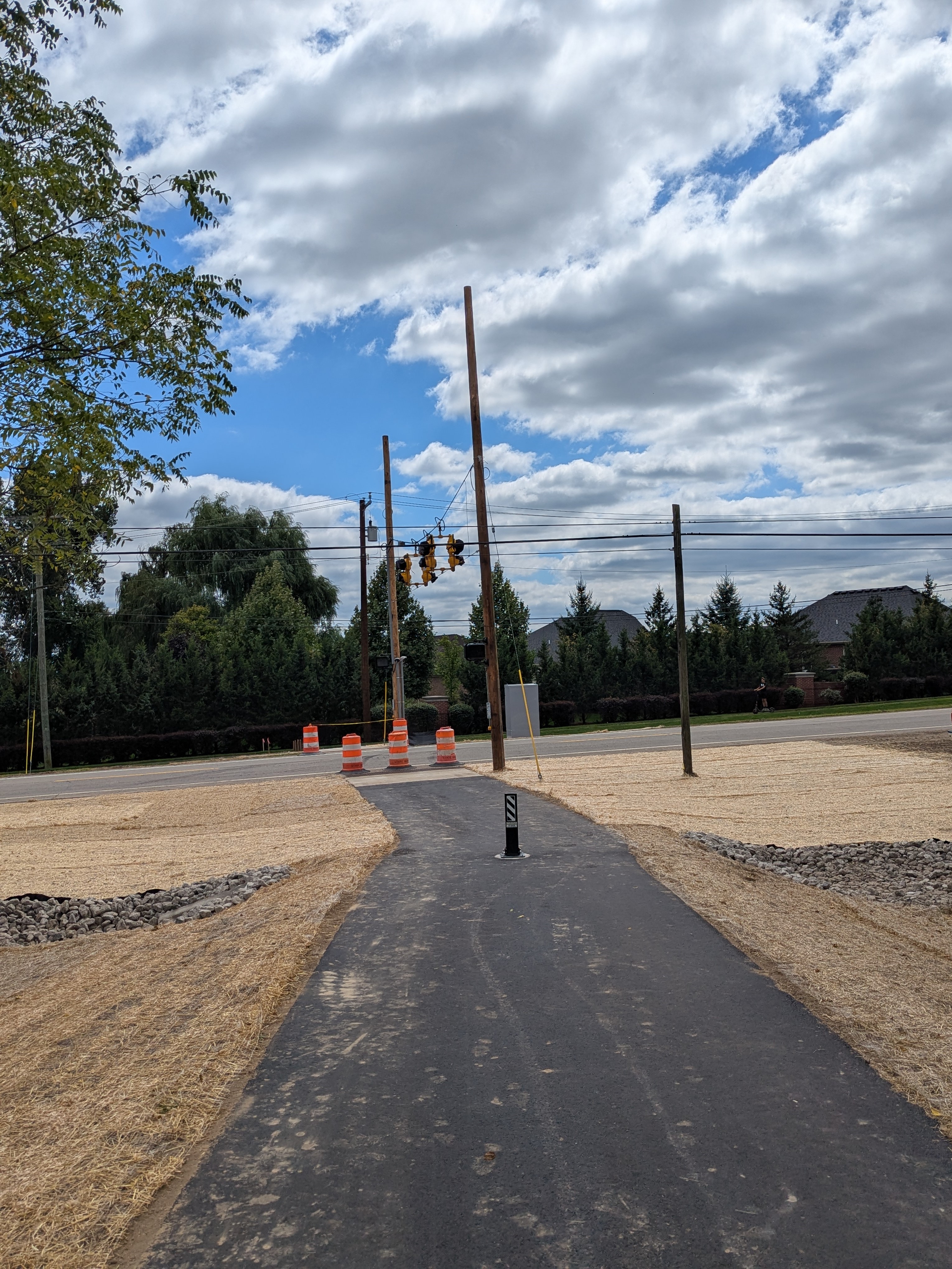 Final steps include 7 Mile Road crosswalk line painting, path signage, and DTE crosswalk signal light connection and electrical inspection.