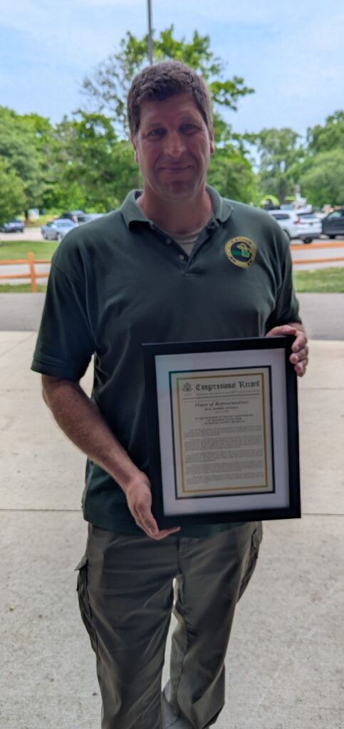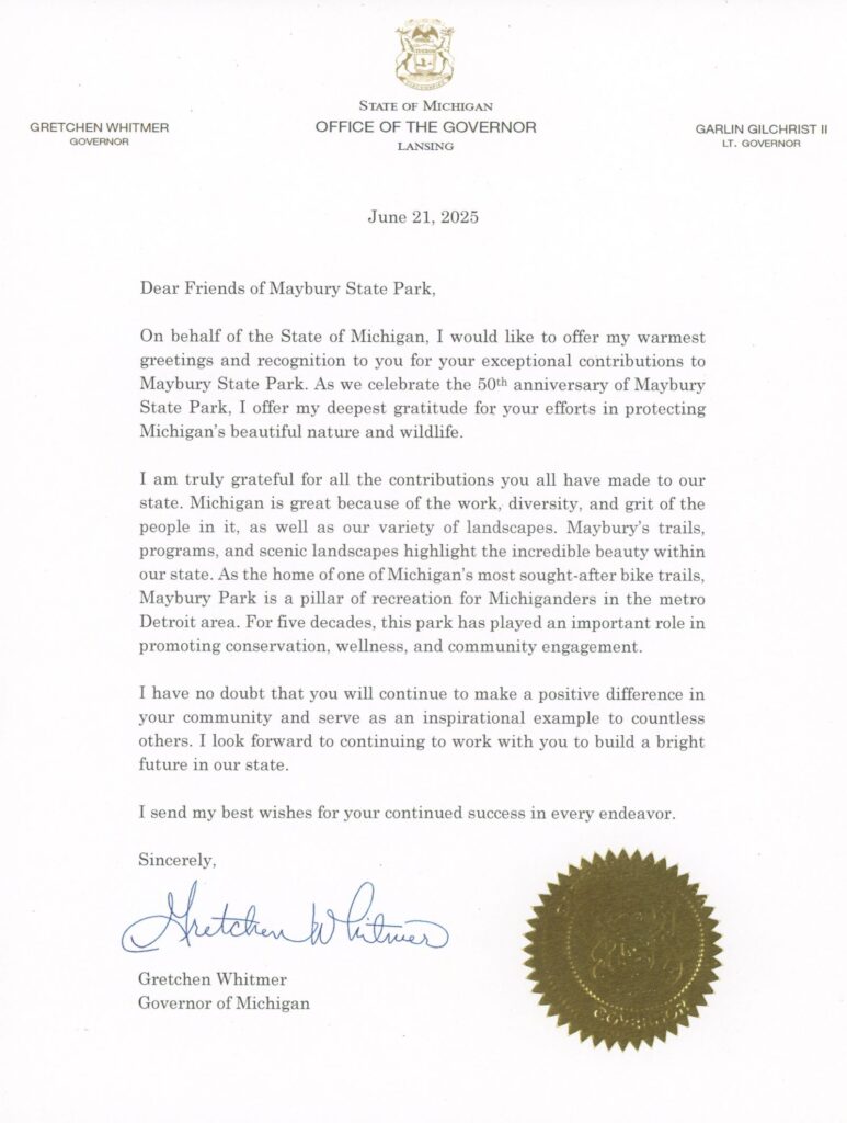 The park received State and National recognition as well! Below, Kale holds a letter from House of Representatives, Hon. Debbie Dingell, recognizing Maybury State Park’s extraordinary work and remarkable history. Next to this is a Letter of Recognition from the Office of the Governor, Gretchen Whitmer, for being a “pillar of recreation for Michiganders in the metro Detroit area.”