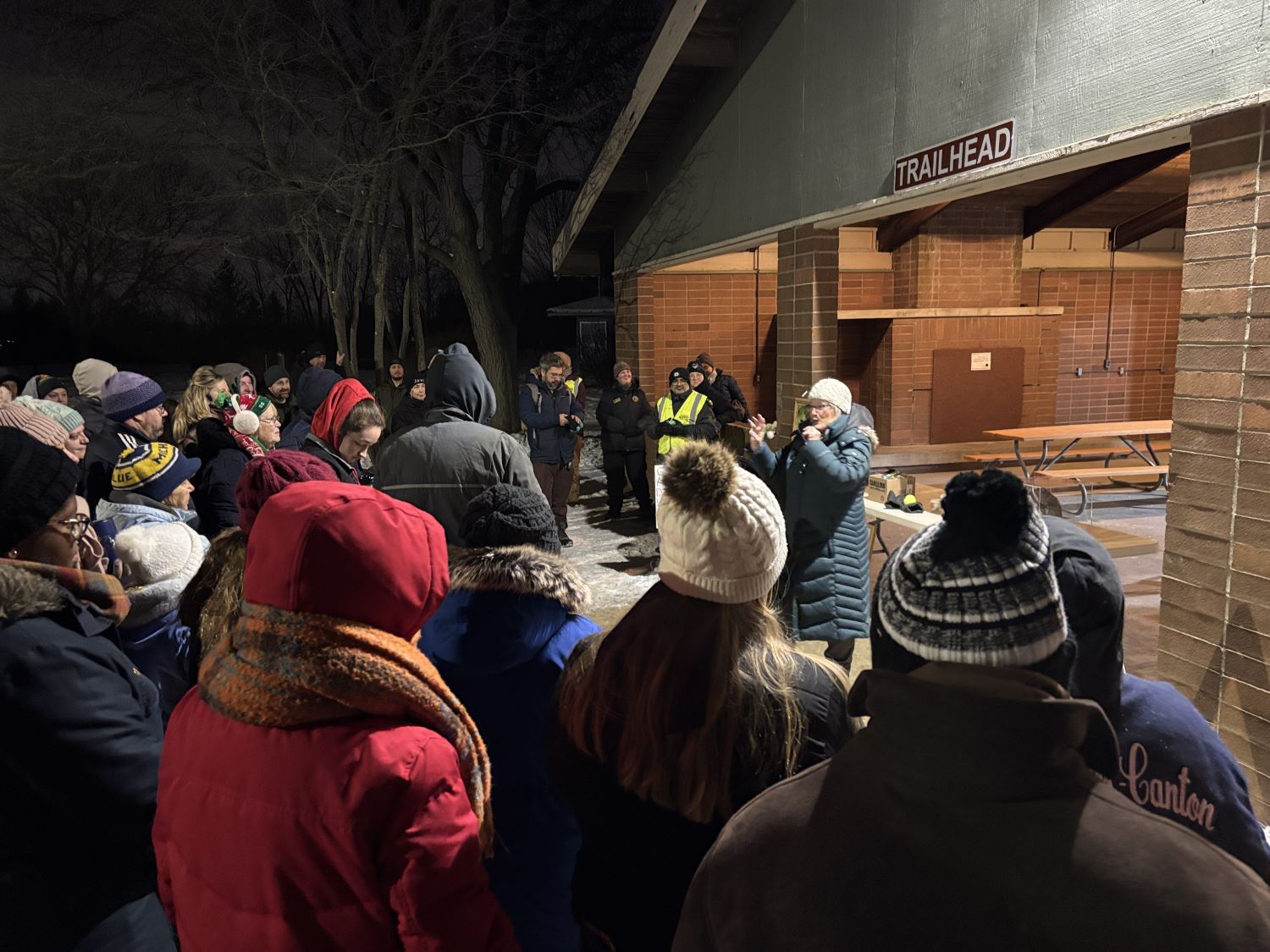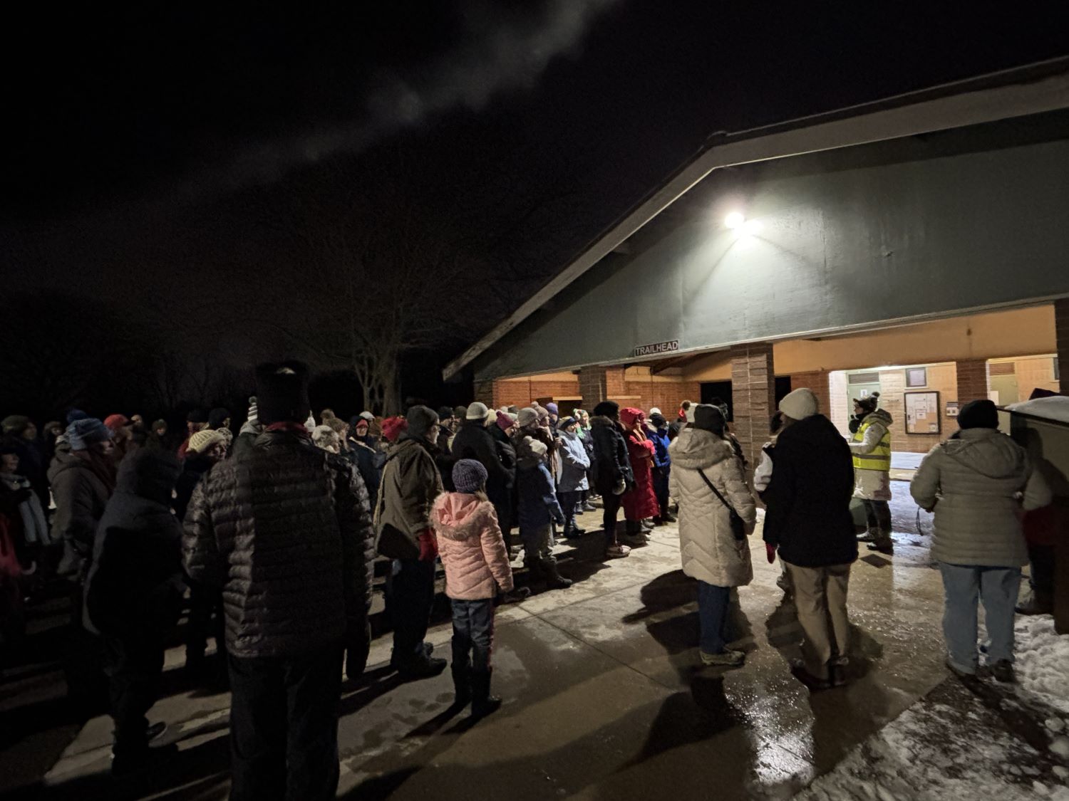 After the informative discussion, five groups of about 20+ people each set off in different directions in search of the park’s owls, specifically the Screech Owl and then the Great Horned Owl. Each group had a leader who played the recorded owl calls and a volunteer mentor in training to lead an owl hike next year. Attendees helped hold up the mini-speaker as the owl calls were played while everyone patiently listened. And waited.